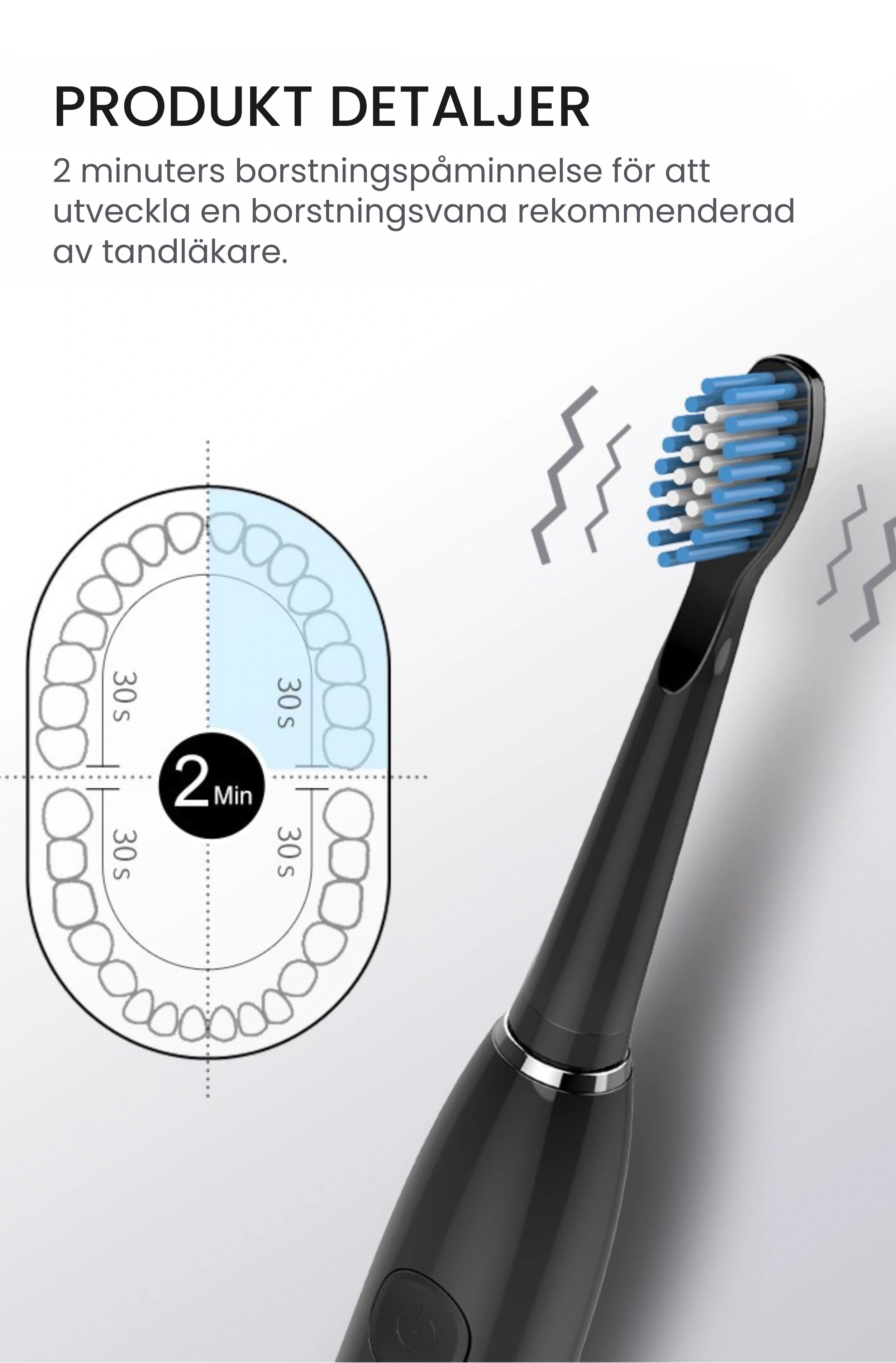 Borsthuvuden: Våra borsthuvuden är speciellt framtagna för att vara mjuka och skonsamma. Du får dessutom 5 extra borsthuvuden med i paketet, inklusive ett unikt utformat